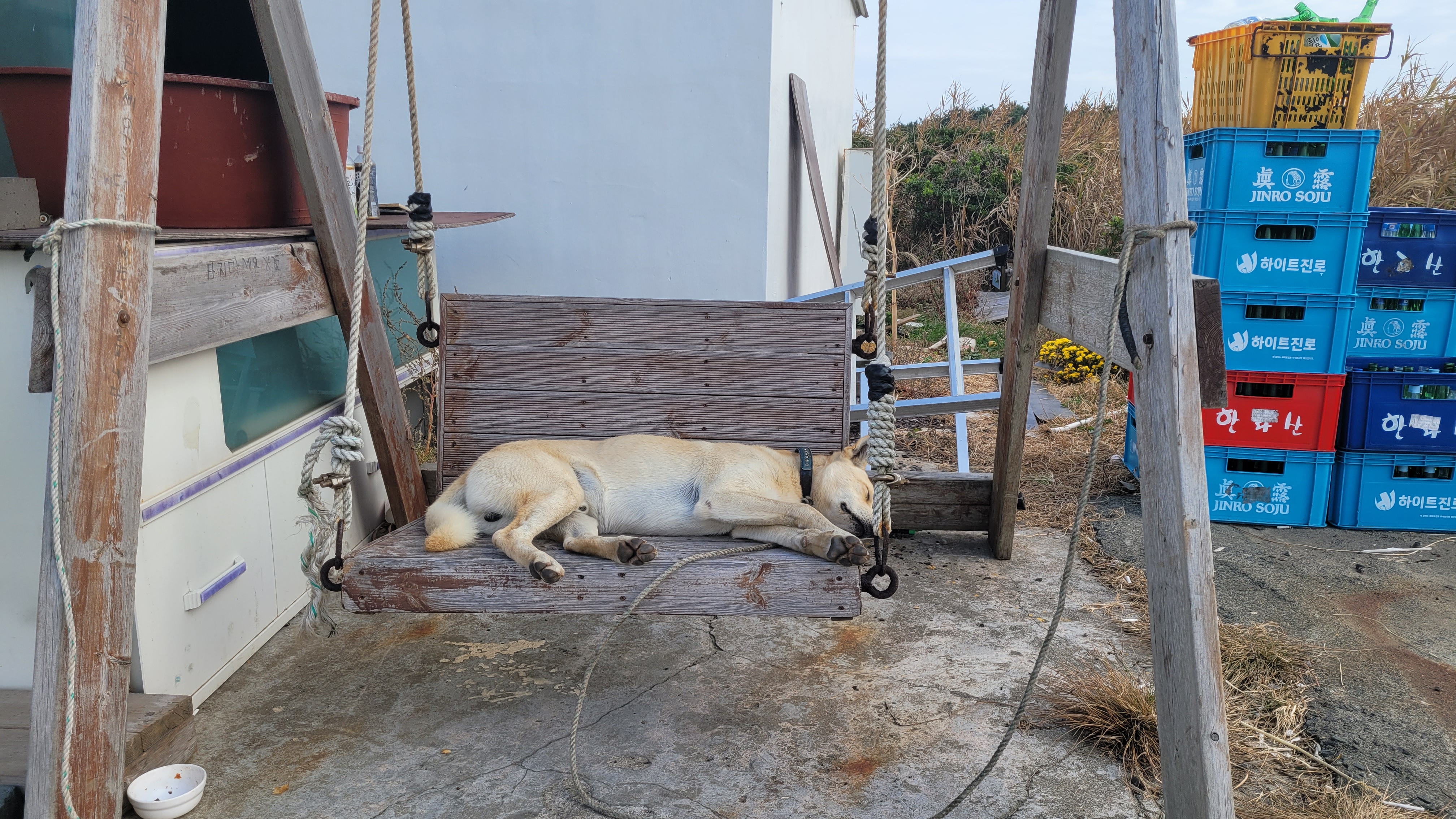 한가롭게 휴식을 취하고 있는 개의 모습이다. 이럴 때를 두고 "개팔자 상팔자"라고 한다.