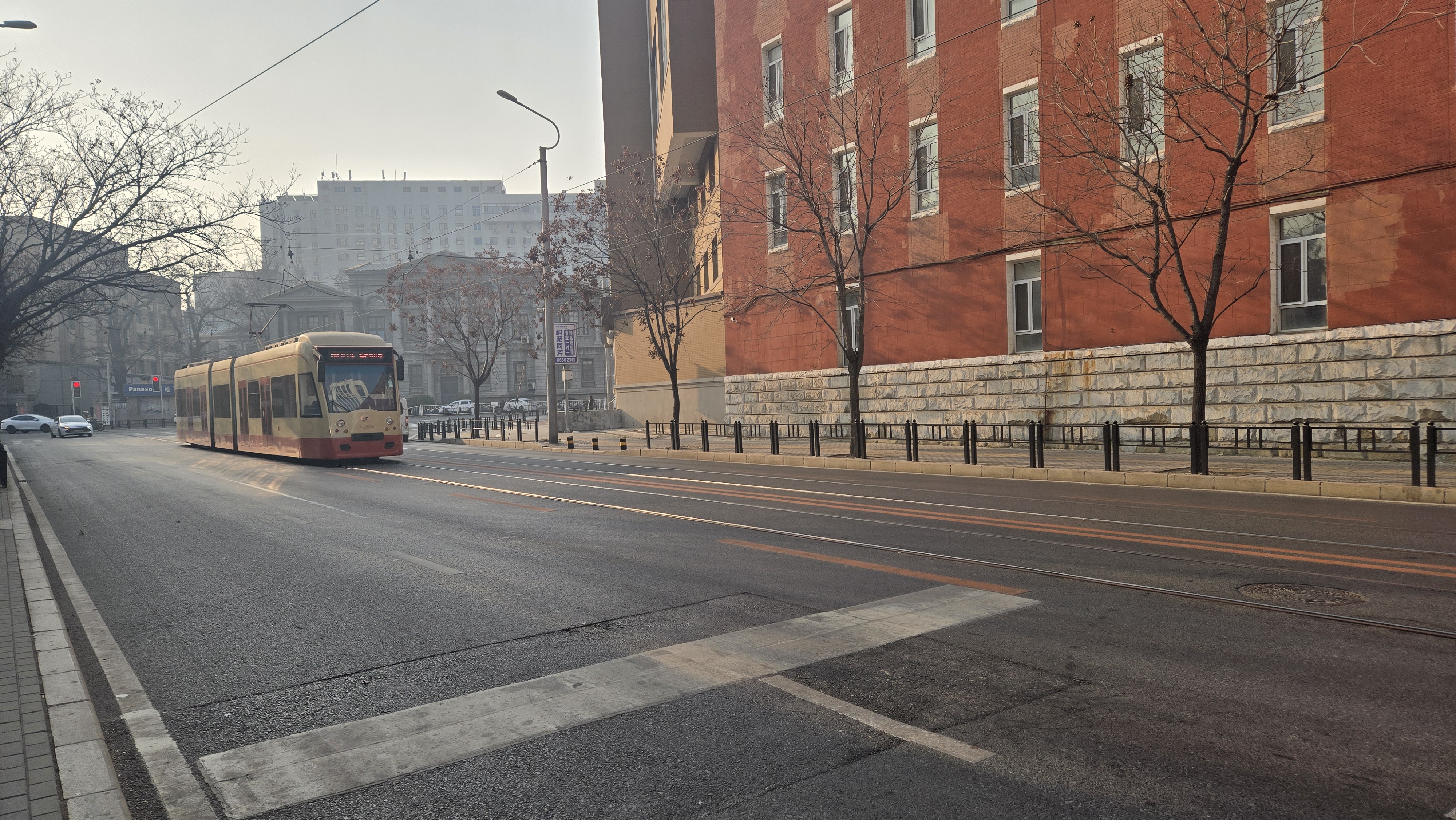 철길을 따라 달리는 열차가 들어온다. 요금은 2위안이고 운전기사 1명에 차장 2명이 있었다.