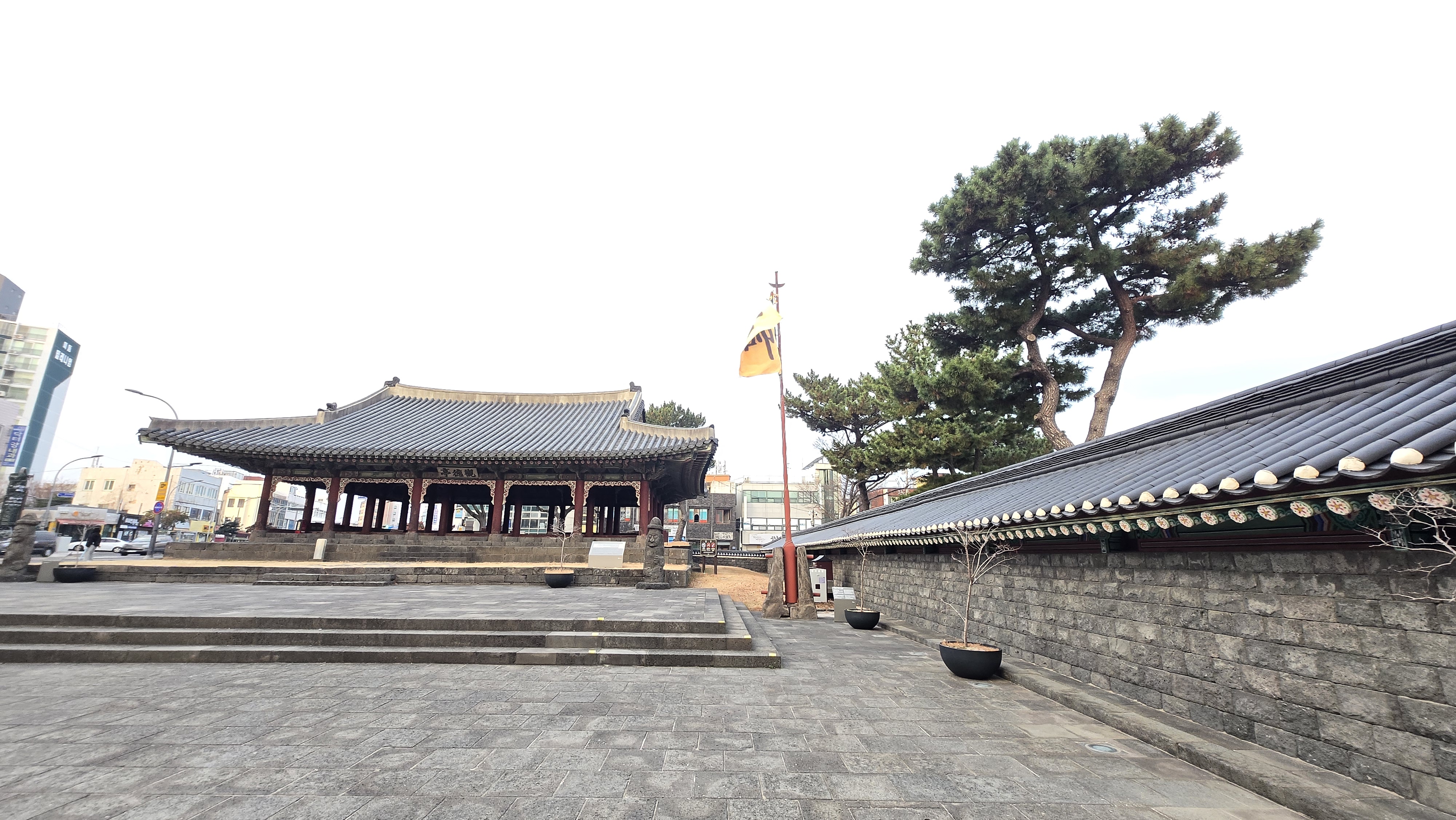 제주목방어사의 황수기가 높게 걸려있다. 오른쪽은 "폭싹속았쑤다" 촬영지인 제주목관아의 담장이다. 이제 제주 관덕정을 뒤로하고 다음 여행지 오현단으로 떠난다.